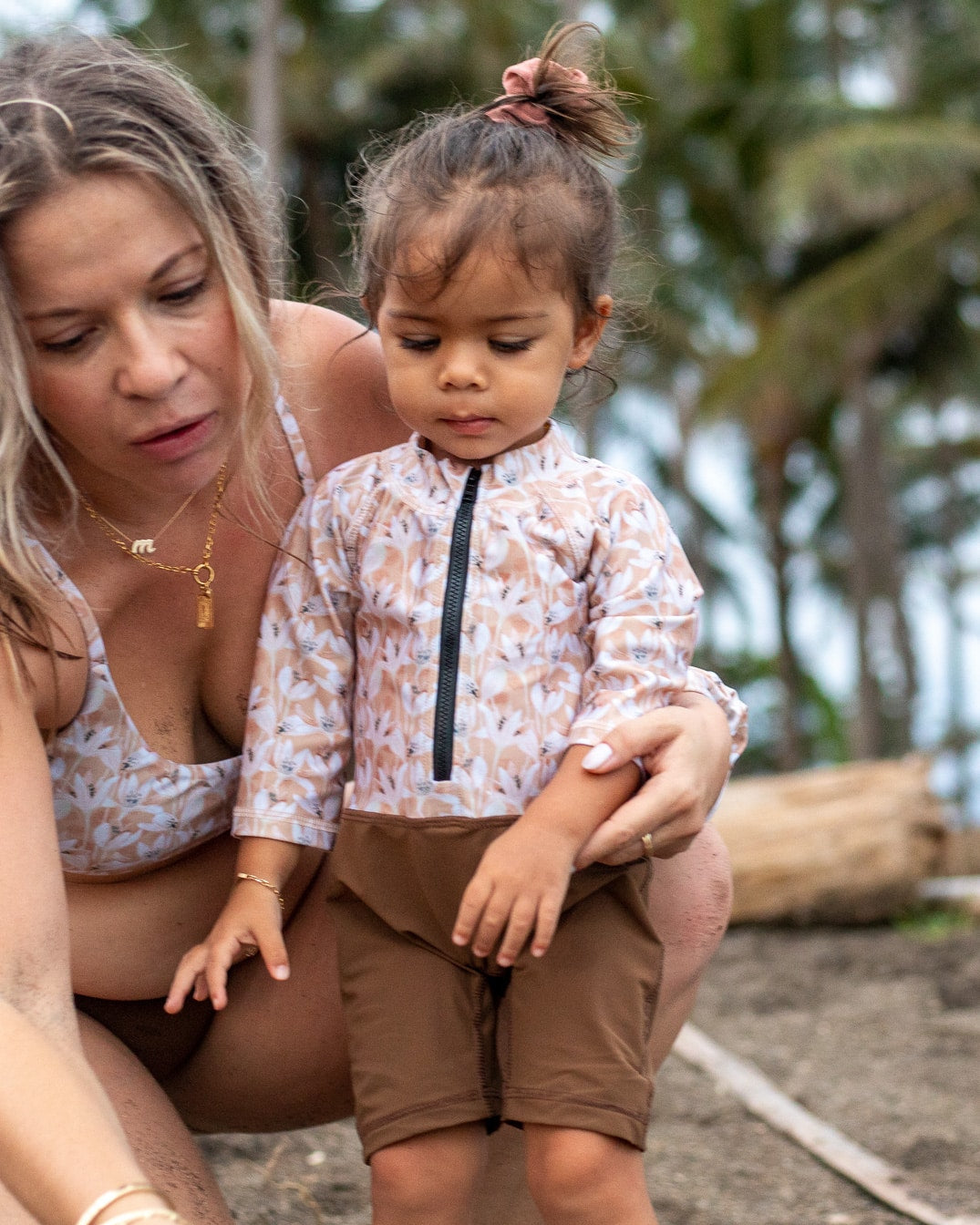 Unsere Bademode ist aus weichem, qualitativ hochwertigem und chlorresistentem Stoff mit UPF 50+ Sonnenschutzfaktor. Alle Stoffe sind nachhaltig und aus recycelten Materialien hergestellt.