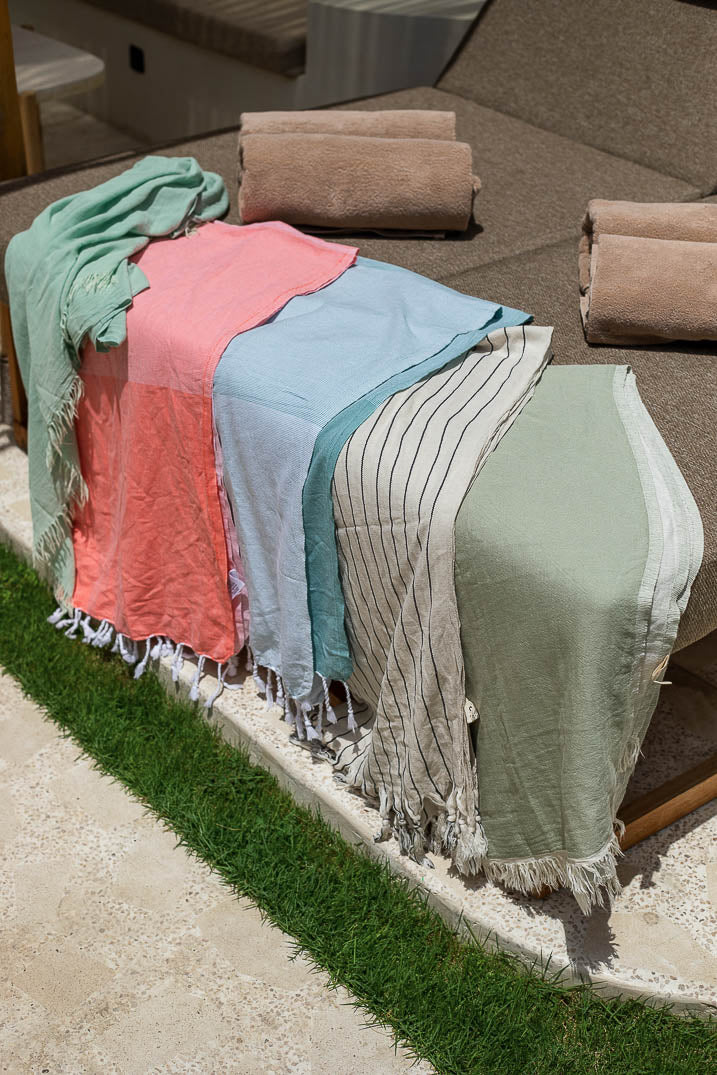 The possible uses are endless. Use the towel as a hammam towel, beach towel, bath towel, picnic blanket or as a light bedspread. Thanks to its low weight and practical size, it fits in any bag and is a perfect travel companion.