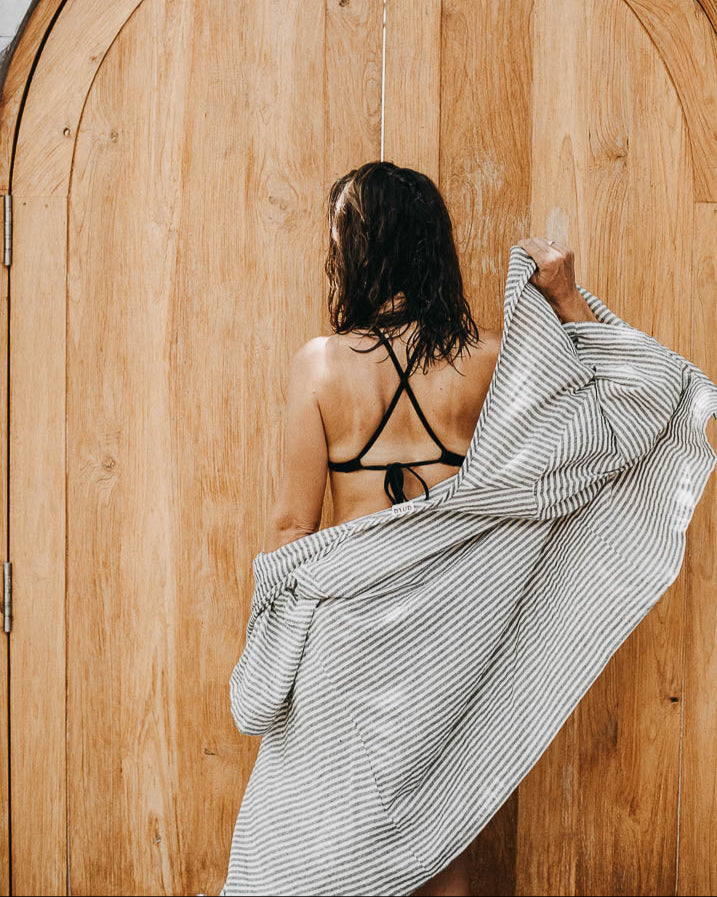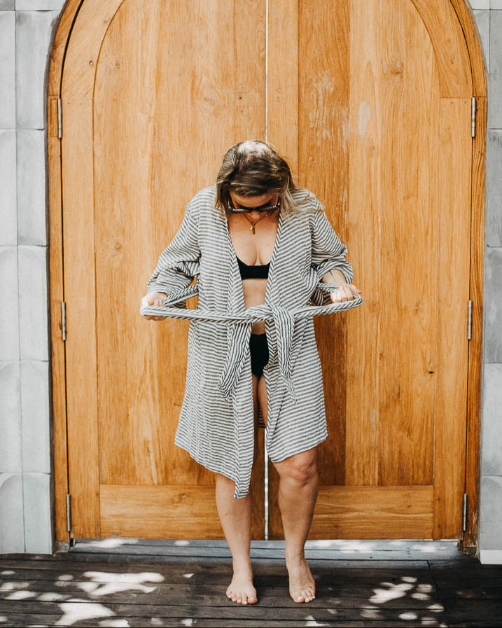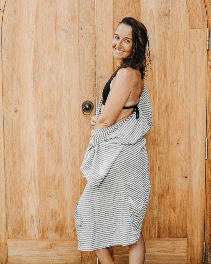 Our kimono is cropped and available in one size to give you a comfortable fit. With 3/4 sleeve length, it is versatile and perfect for relaxing moments at home, while travelling or by the water.